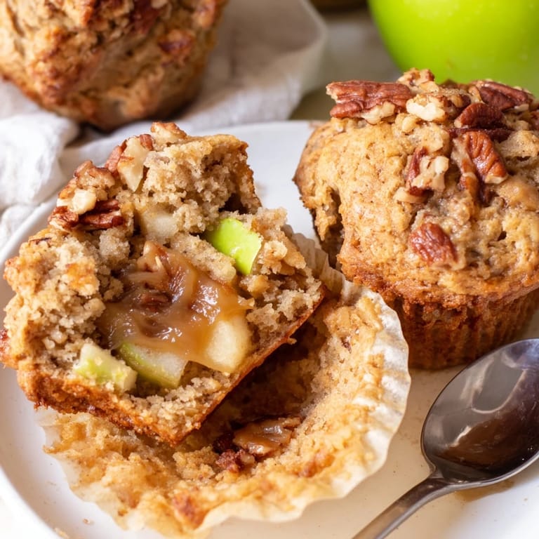 Save Moist, tender muffins filled with chunks of apple, toasted pecans, and swirls of caramel, perfect for a cozy breakfast or sweet snack.
