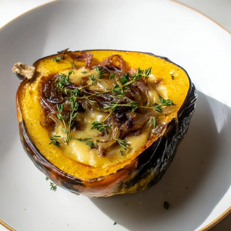 Save Acorn squash halves roasted until tender, stuffed with deeply caramelized onions and melty Gruyere cheese, and finished with fresh herbs—a comforting, gourmet vegetarian main perfect for any occasion.