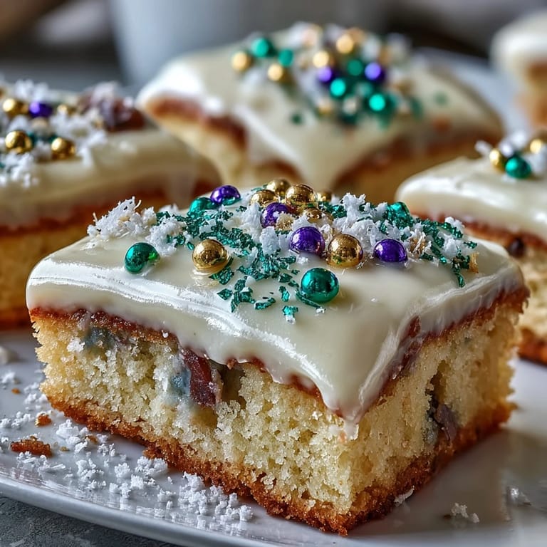 King Cake is the centerpiece of Mardi Gras tradition—it's eaten during the entire carnival season and typically contains a hidden object inside, traditionally a dried bean but now often a plastic baby. The colors purple, green, and gold each symbolize something: justice, faith, and power respectively. By turning this iconic dessert into bars, you're keeping the tradition alive while making it infinitely more practical for modern gatherings where sliding someone a whole cake isn't always feasible.