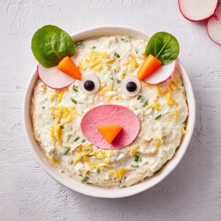 Use a small round bowl to shape the dip, place a pink tortilla or ham round for the snout, add baby carrot slices for nostrils, black olive slices for eyes, radish slices for ears, and spinach leaves for detail.