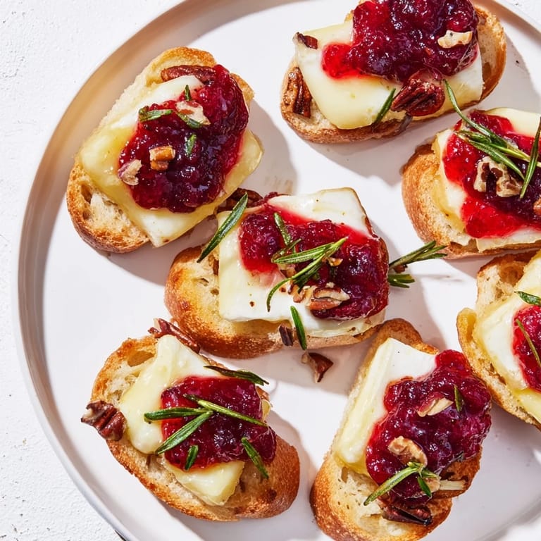 Save A festive and elegant appetizer featuring creamy Brie, tangy cranberry sauce, and crispy toasted baguette slices—perfect for entertaining or holiday gatherings.