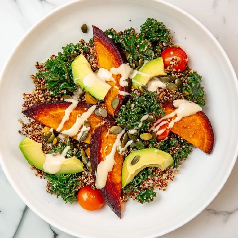 Save A vibrant, nutrient-packed bowl featuring earthy roasted beets, fluffy quinoa, and crisp kale, all brought together with a creamy tahini dressing. Perfect for a wholesome lunch or light dinner.