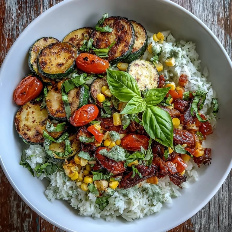 Vibrant bowl with sautéed zucchini, tomatoes, corn, and bell peppers over fluffy rice, finished with fresh basil.