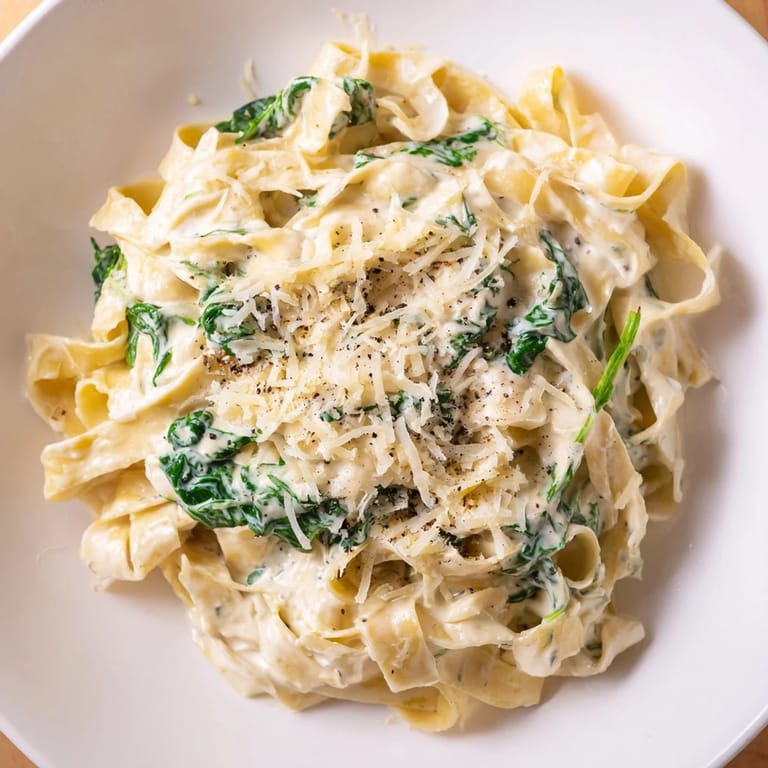 I remember the first time I made this for my sister, who showed up unannounced on a rainy afternoon. She walked in complaining about being hungry, and thirty minutes later she was twirling pasta on her fork like she'd just discovered something magical, asking me if I'd been secretly trained as a chef. I hadn't—I just knew that good cream, good garlic, and patience with the spinach could turn something simple into something memorable.