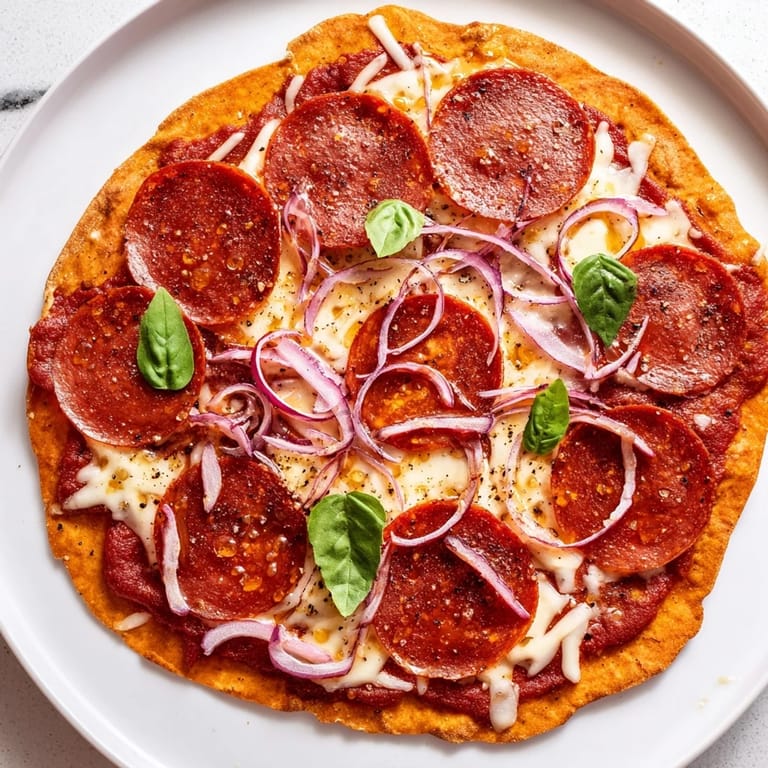 This flatbread features a crisp base layered with zesty pizza sauce, melted mozzarella, and spicy pepperoni slices. A drizzle of infused hot honey blends sweetness and heat, complemented by fresh basil and thin red onion slices. Baking yields a golden crust with bubbly cheese, creating a flavorful balance of spicy, sweet, and savory notes. Ideal for a quick and satisfying meal.